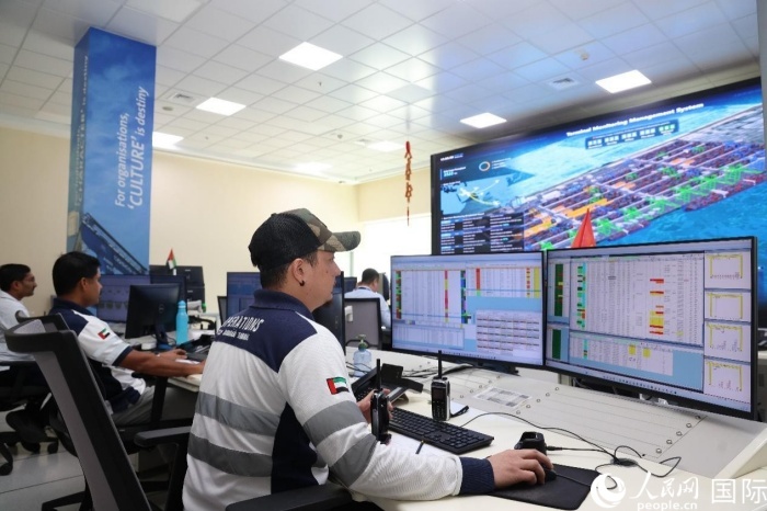 與會嘉賓會后到中遠海運港口阿布扎比碼頭中央控制室參觀。圖為工作人員使用數(shù)字孿生系統(tǒng)查看作業(yè)情況。人民網(wǎng)記者 任皓宇攝