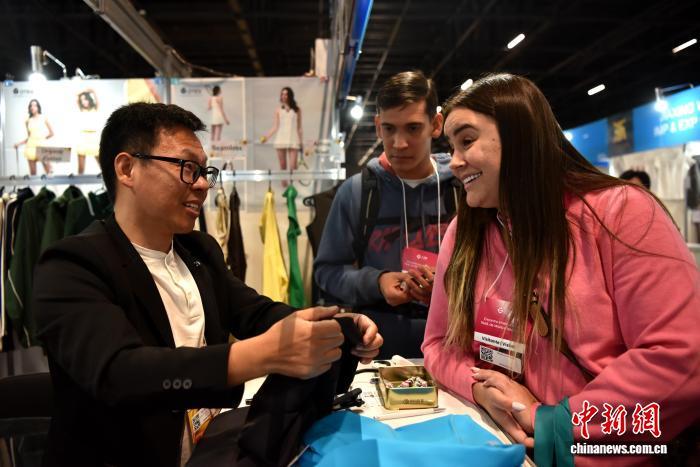 8月5日,為期3天的2025年巴西圣保羅紡織面料及服裝展覽會在巴西圣保羅安年比會展中心開展。圖為經營運動服裝的上海參展商(左一)在向巴西客商介紹無縫線粘合制衣技術。 中新社記者 林春茵 攝