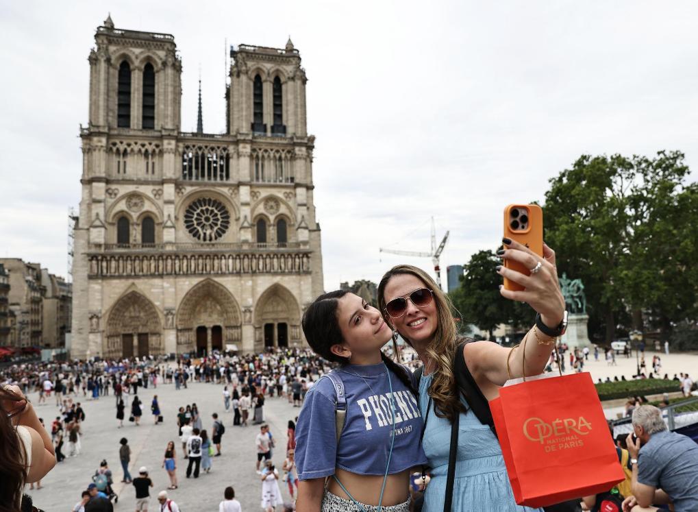 7月5日,兩名女子在法國巴黎圣母院前自拍。新華社記者高靜攝