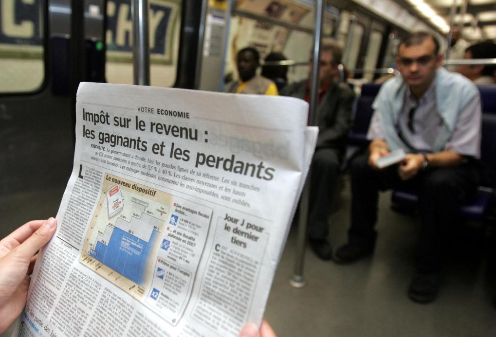 2005年9月15日,在法國首都巴黎的地鐵列車上,一位乘客閱讀當天出版的《巴黎人報》上關(guān)于個人所得稅改革方案的報道。新華社記者宋立東攝