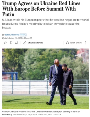 △《華爾街日?qǐng)?bào)》報(bào)道,特朗普與歐洲盟友及烏克蘭就阿拉斯加峰會(huì)有關(guān)立場(chǎng)達(dá)成了一致。