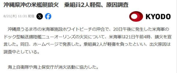 據(jù)報道,當(dāng)?shù)貢r間20日下午,在沖繩縣宇流麻市美軍設(shè)施“白灘”近海的美船塢運輸?shù)顷懪灐靶聤W爾良”號發(fā)生火災(zāi),隨后包括日本海上自衛(wèi)和海上保安廳等日方人員也參與了滅火行動。