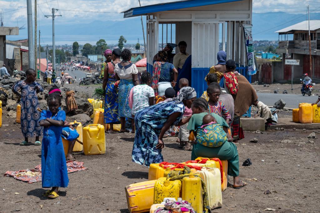 5月6日,在剛果(金)東部北基伍省戈馬市郊,流離失所者在原營地附近的一處取水點(diǎn)等待取水。新華社記者鄭揚(yáng)子攝