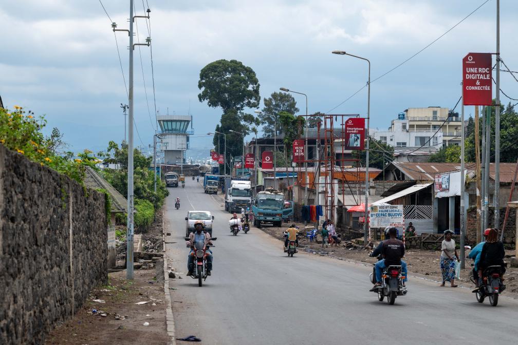 這是5月5日在剛果(金)東部北基伍省戈馬市拍攝的市中心街道和遠(yuǎn)處的機(jī)場塔臺。新華社記者鄭揚(yáng)子攝