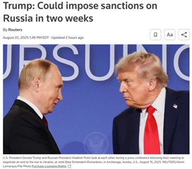 當?shù)貢r間8月22日,美國總統(tǒng)特朗普表示,他將在兩周內(nèi)決定是否對俄羅斯實施“大規(guī)模制裁”。而就在此前一周,美俄首腦會晤剛剛在阿拉斯加舉行,特朗普表示“會談非常好”。