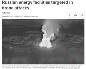 烏方稱這是對“美國投資”的有意打擊,并迅速組織回擊,在次日對俄羅斯的德魯日巴輸油管泵關(guān)鍵站點實施攻擊,俄羅斯供給匈牙利和斯洛伐克的原油隨即暫時停擺。有關(guān)方面稱,恢復至少需要5天。同一天,烏軍稱,他們還在塞瓦斯托波爾摧毀了俄軍的偵查無人機設施。