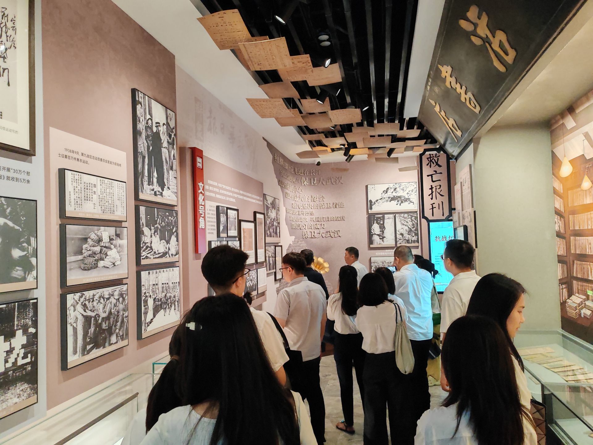“生活書店” 場景則以漢口分店為原型,復(fù)刻藍底白字的 “交通路63號” 門牌與1938年初版《魯迅全集》書脊,展柜內(nèi)的抗戰(zhàn)書籍搭配互動抽拉裝置、多媒體查詢屏,方便觀眾查閱當(dāng)年武漢發(fā)行的報刊雜志細節(jié)。展覽尾廳的 “V 字勝利墻”,匯集1945年各國報刊關(guān)于日本投降的新聞標(biāo)題與多語言 “日本投降” 字樣,成為觀眾打卡留念、感悟勝利意義的熱門點位。