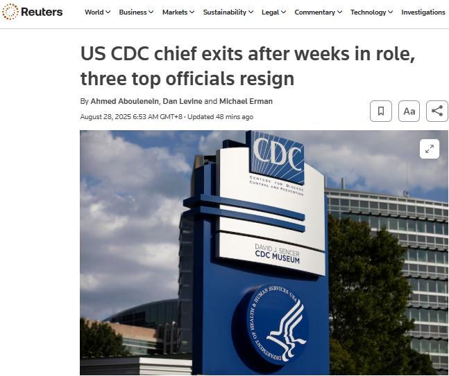 據(jù)報(bào)道,美國(guó)疾控中心醫(yī)療官員黛布拉·霍里、免疫與呼吸道疾病中心主任德米特·達(dá)斯卡拉基斯、美國(guó)國(guó)家新發(fā)與人畜共患傳染病中心主任丹·杰尼根均已辭去職務(wù)。