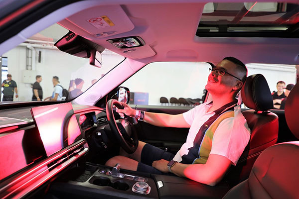 觀眾體驗(yàn)長城汽車的新能源車(前)。人民網(wǎng)記者 戴楷然攝