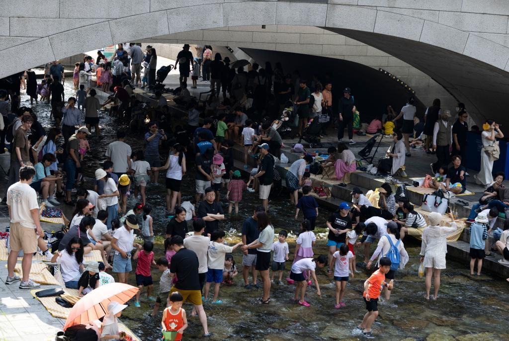 6月14日,人們在韓國首爾的清溪川戲水。新華社發(fā)(全休相攝)