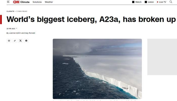 據(jù)報(bào)道,A23a冰山此前重近一萬(wàn)億噸,面積3672平方公里,自1980年代以來(lái),A23a多次獲得“當(dāng)前最大冰山”的稱號(hào)。