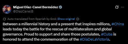 報(bào)道稱,迪亞斯-卡內(nèi)爾在社交媒體上贊揚(yáng)中國政府和軍隊(duì),并對(duì)中方作為東道主的熱情款待表示感謝。