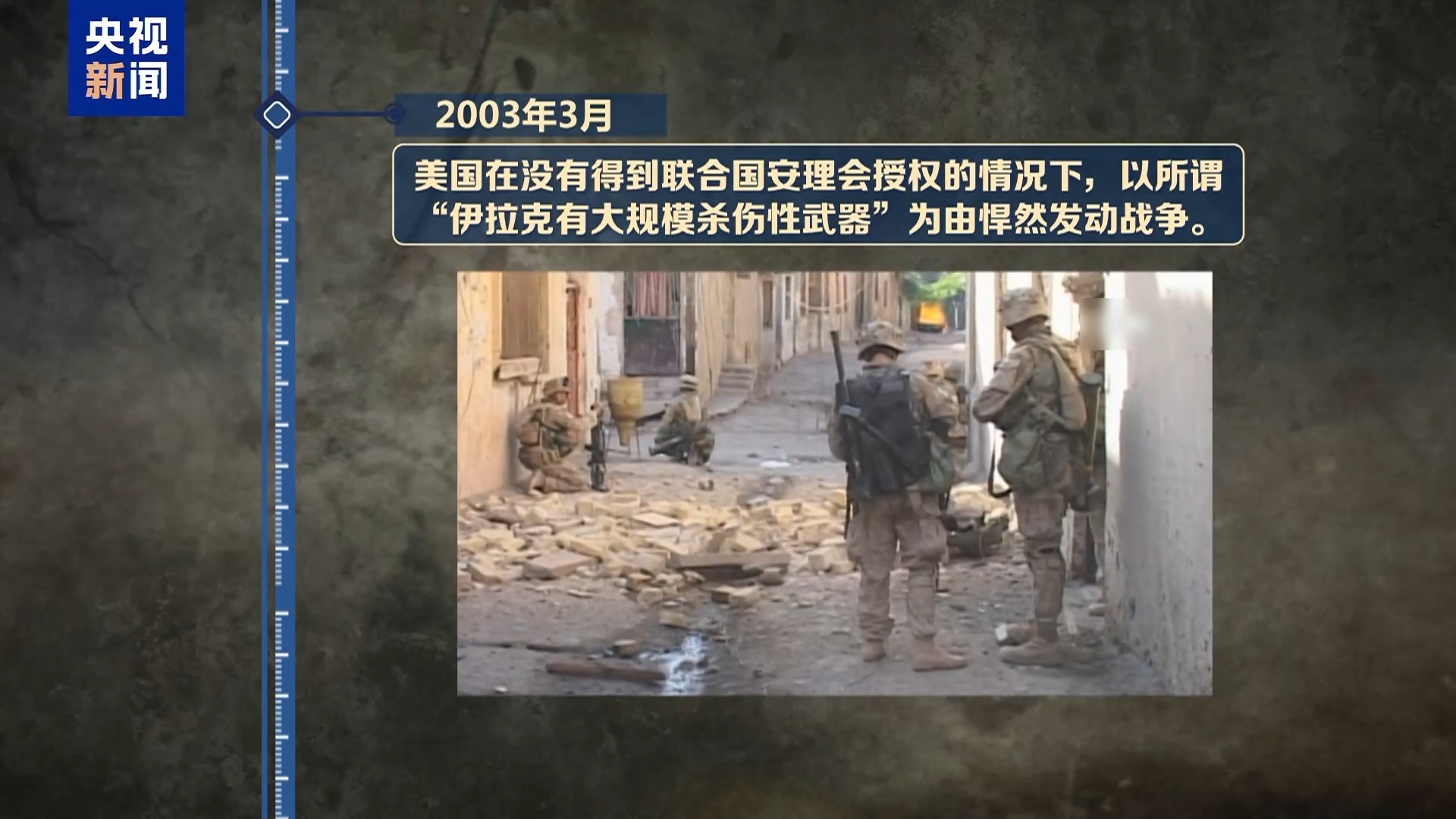 2003年3月,美國在沒有得到聯(lián)合國安理會(huì)授權(quán)的情況下,以所謂“伊拉克有大規(guī)模殺傷性武器”為由悍然發(fā)動(dòng)戰(zhàn)爭。以美軍為首的聯(lián)軍肆意射殺、關(guān)押、虐待無辜平民,無差別轟炸居民區(qū),甚至大量使用白磷彈、貧鈾彈。到2011年12月美軍戰(zhàn)斗部隊(duì)全部撤離,伊拉克戰(zhàn)爭導(dǎo)致約20萬至25萬平民死亡。