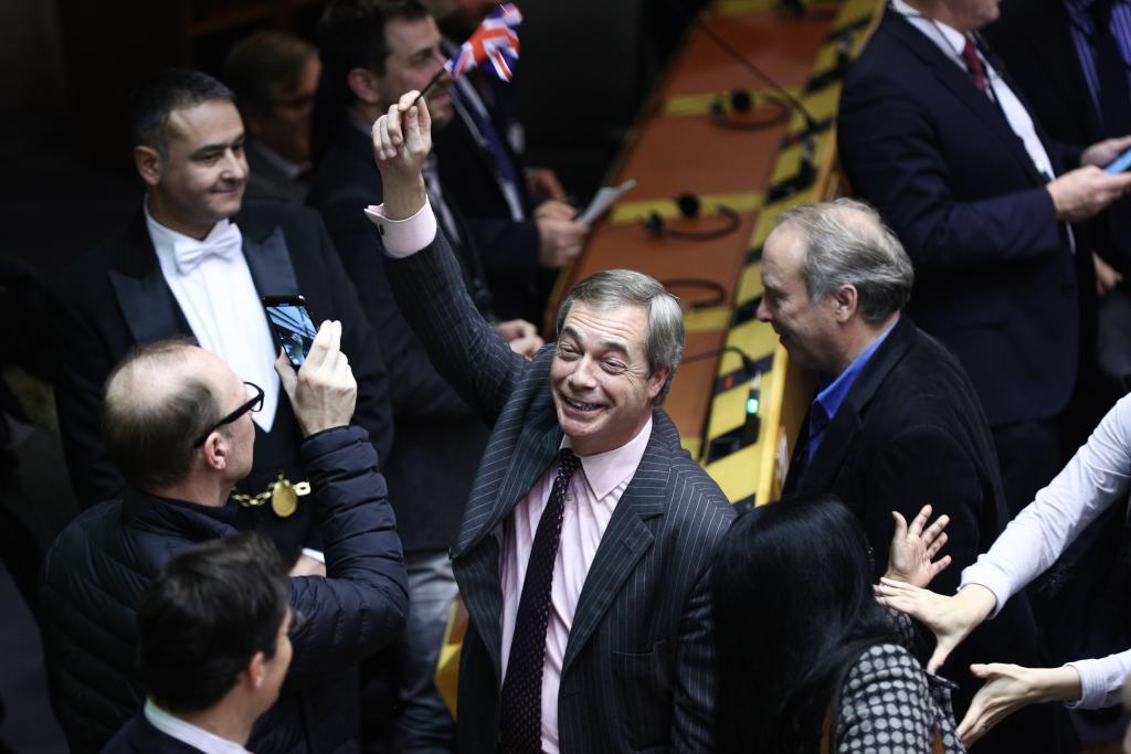 2020年1月29日,在比利時布魯塞爾,英國“脫歐黨”領袖、歐洲議會議員奈杰爾·法拉奇在英國“脫歐”協(xié)議投票結果公布后慶祝。新華社記者鄭煥松攝