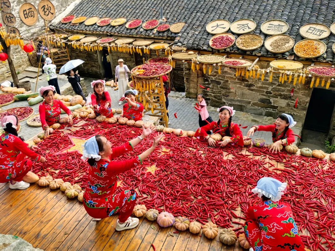 【豐收調(diào)色盤】登高遠眺,整個古村宛如打翻的調(diào)色盤。辣椒紅、玉米黃、南瓜橙...在青瓦飛檐間鋪展成壯觀的豐收圖卷。最佳攝影點已就位,等您收錄今秋最動人的畫。