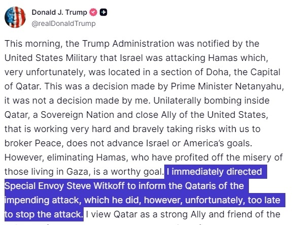 9日,美國(guó)總統(tǒng)特朗普在其社交平臺(tái)“真實(shí)社交”發(fā)文稱,當(dāng)天上午,政府接到美軍通知,以色列正在對(duì)位于多哈某區(qū)域的哈馬斯目標(biāo)實(shí)施襲擊。特朗普稱,襲擊是以總理內(nèi)塔尼亞胡單方面的決定,而不是他的決定。特朗普稱,他當(dāng)時(shí)“立即指示特使威特科夫向卡塔爾通報(bào)即將發(fā)生的襲擊”。襲擊發(fā)生后,他與卡塔爾埃米爾(國(guó)家元首)及首相通話,保證此類事件不會(huì)在其領(lǐng)土重演。他還已指示國(guó)務(wù)卿魯比奧盡快完成與卡塔爾的防務(wù)合作協(xié)議。