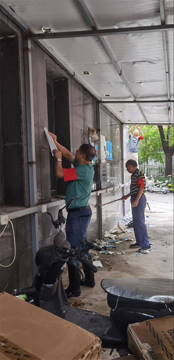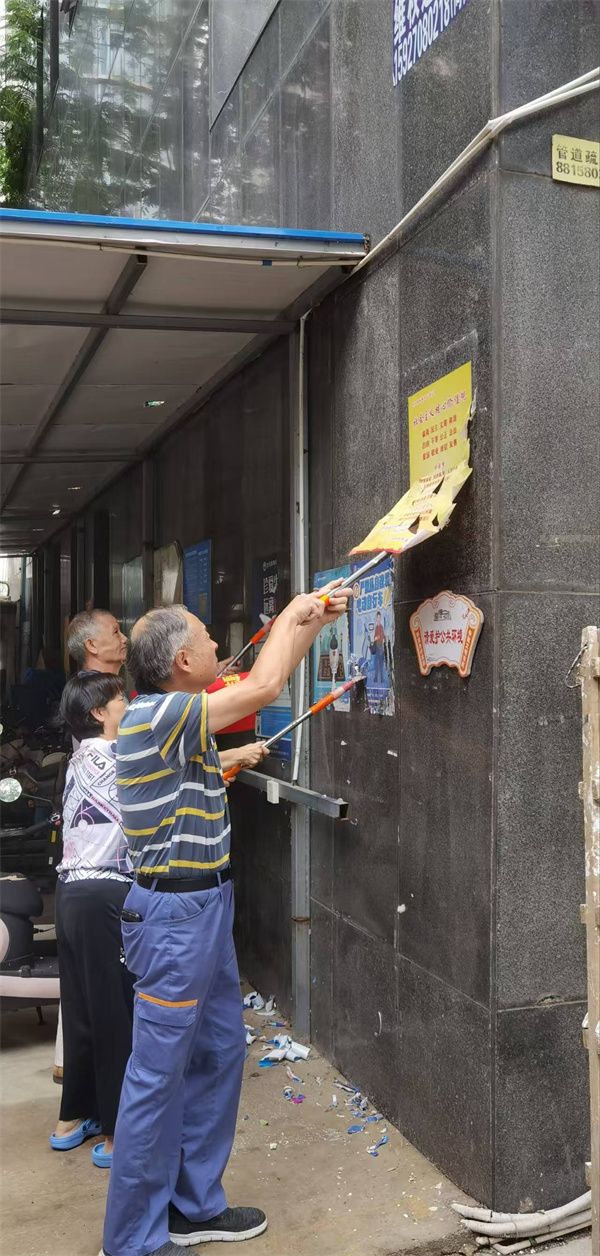 行動(dòng)中,志愿者們分為兩組,分工協(xié)作、高效推進(jìn)。“牛皮癬”清理組攜帶專業(yè)工具,對(duì)小區(qū)各樓棟墻面、單元門、電梯間及公共設(shè)施上的各類小廣告進(jìn)行徹底清理。面對(duì)黏附牢固的廣告貼紙,大家先以噴壺濕潤(rùn)軟化,再細(xì)致鏟除,最后用抹布擦拭干凈,不遺漏任何一處衛(wèi)生死角。