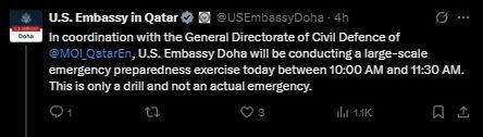美國駐卡塔爾使館表示,美方此次演練與卡塔爾民防總局協(xié)調(diào)進行。