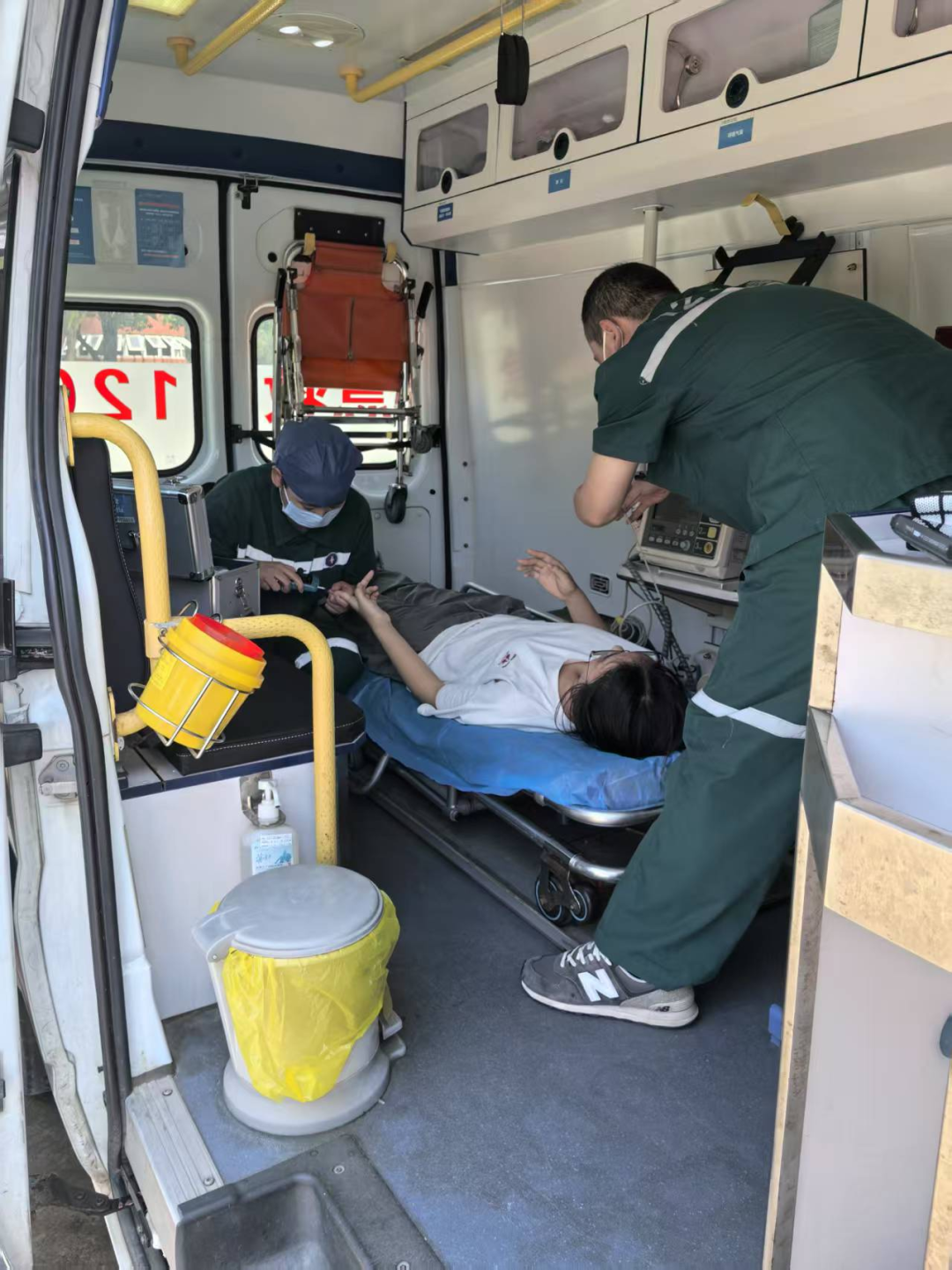 抵達現(xiàn)場后,醫(yī)護人員迅速將該女生攙扶至急救車內,隨即啟動標準化醫(yī)療處置流程。程晨第一時間為學生進行生命體征評估,同時耐心詢問學生近期飲食、作息情況及身體不適癥狀,全面掌握學生身體狀況;肖蝶則立刻進行血糖檢測,血糖儀結果顯示2.8mmol/L”—— 這是典型的軍訓期間能量消耗過大、營養(yǎng)補充不足引發(fā)的低血糖事件。