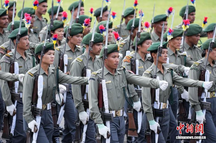 9月19日,尼泊爾臨時政府舉行憲法日暨國慶日慶?;顒?,紀念尼泊爾現(xiàn)行憲法頒布施行十周年。圖為尼泊爾武警部隊接受檢閱。中新社記者 崔楠 攝