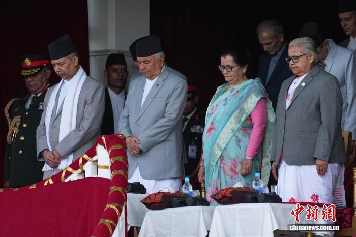 9月19日,尼泊爾臨時政府舉行憲法日暨國慶日慶?;顒樱岵礌柨偨y(tǒng)鮑德爾(中)、臨時政府總理卡爾基(右一)等在活動開始前為近期示威游行死難者默哀。中新社記者 崔楠 攝