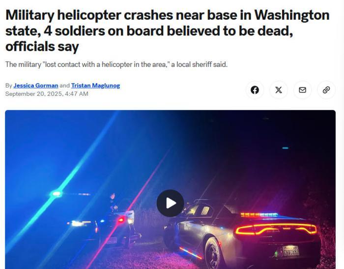 中新網(wǎng)9月20日電 綜合外媒報道,美國陸軍特種作戰(zhàn)司令部當(dāng)?shù)貢r間9月19日確認(rèn),一架MH-60“黑鷹”直升機(jī)日前在華盛頓州劉易斯-麥科德聯(lián)合基地附近墜毀,事故或造成4名士兵遇難。