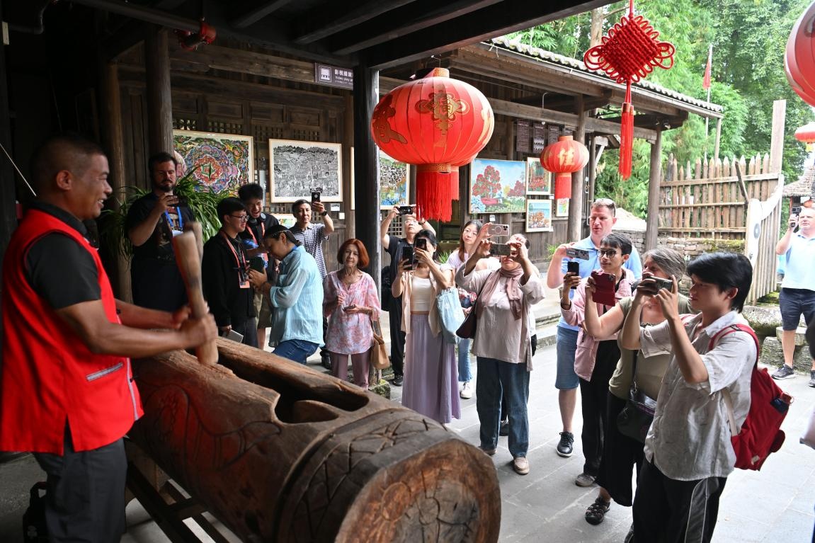 木杵砸進石臼,蒸熟的米粒在一次次撞擊中從散粒變成團塊,最終化作光滑綿韌的米團。在云南騰沖司莫拉佤族村,《巴基斯坦觀察家報》董事長兼總編輯費薩爾·馬利克踏在結實的舂杵上體驗制作大米粑粑,臉上掩不住好奇與欣喜。