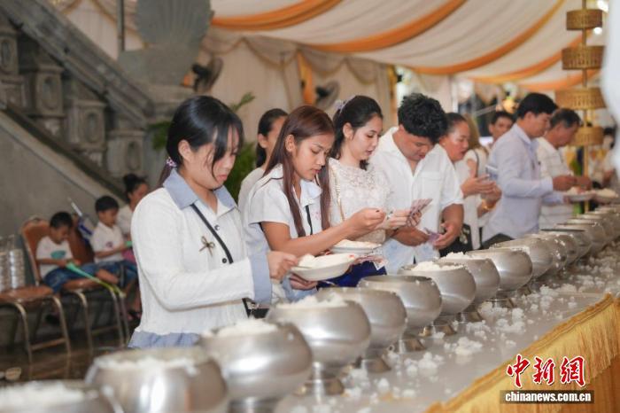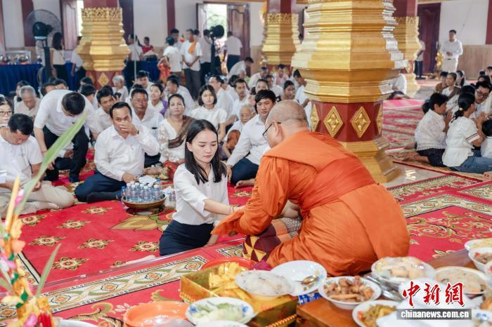 中新社記者日前受邀體驗柬埔寨亡人節(jié)傳統(tǒng)習俗。在金邊1號公路的一座寺廟里,人們帶著鮮花、蠟燭、香火以及各色供品前來布施禮佛,寺廟里的誦經(jīng)聲從凌晨4時到中午12時延綿不絕。人們或席地而坐,虔誠聆聽僧侶誦經(jīng),或排成長龍有序布施。
