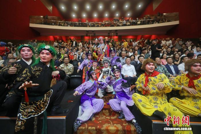 9月23日晚,浙江婺劇團雅加達專場上演。圖為謝幕后,眾演員與觀眾合影。中新社記者 李志全 攝