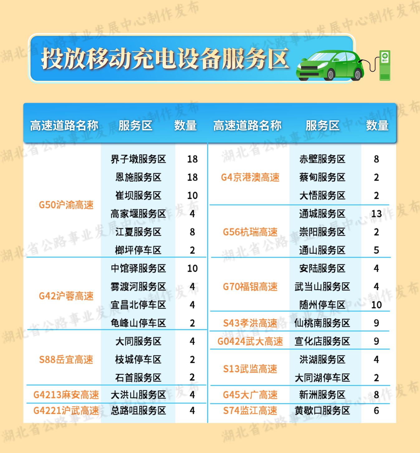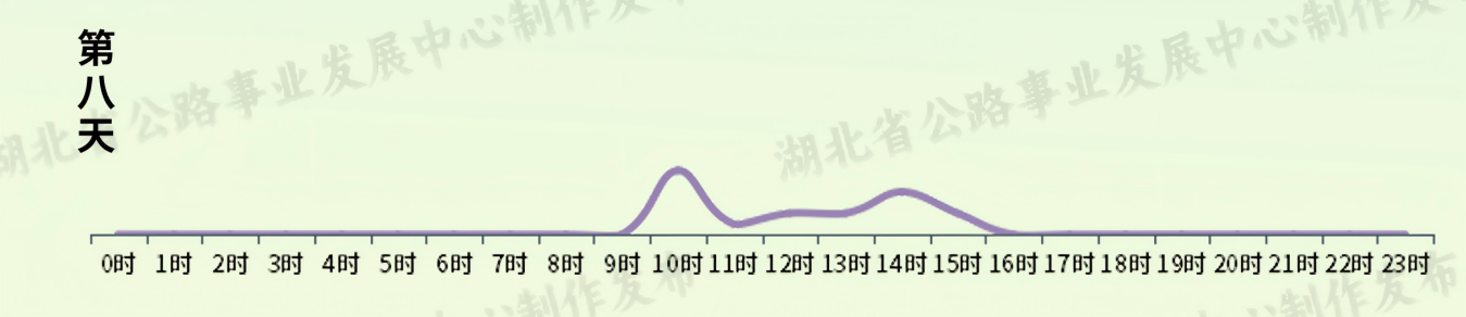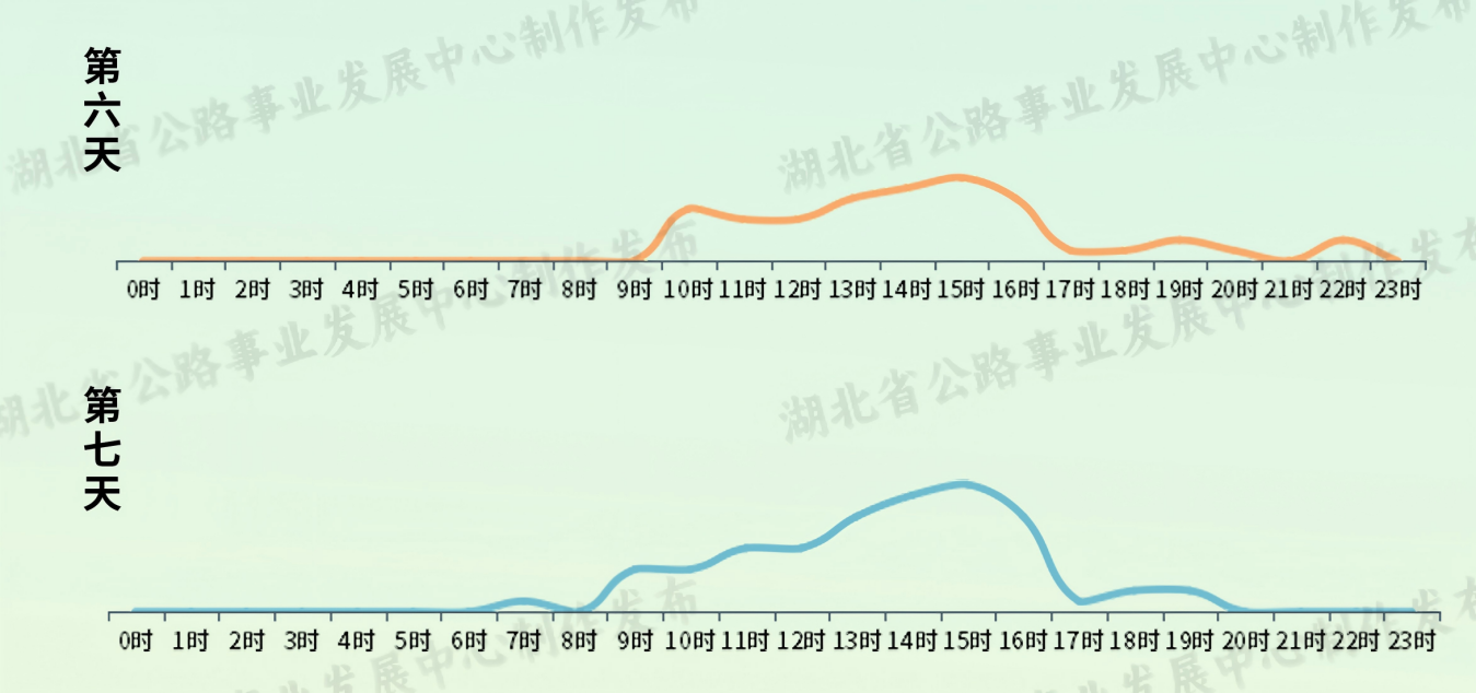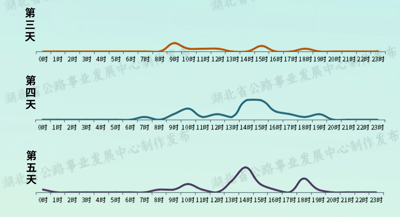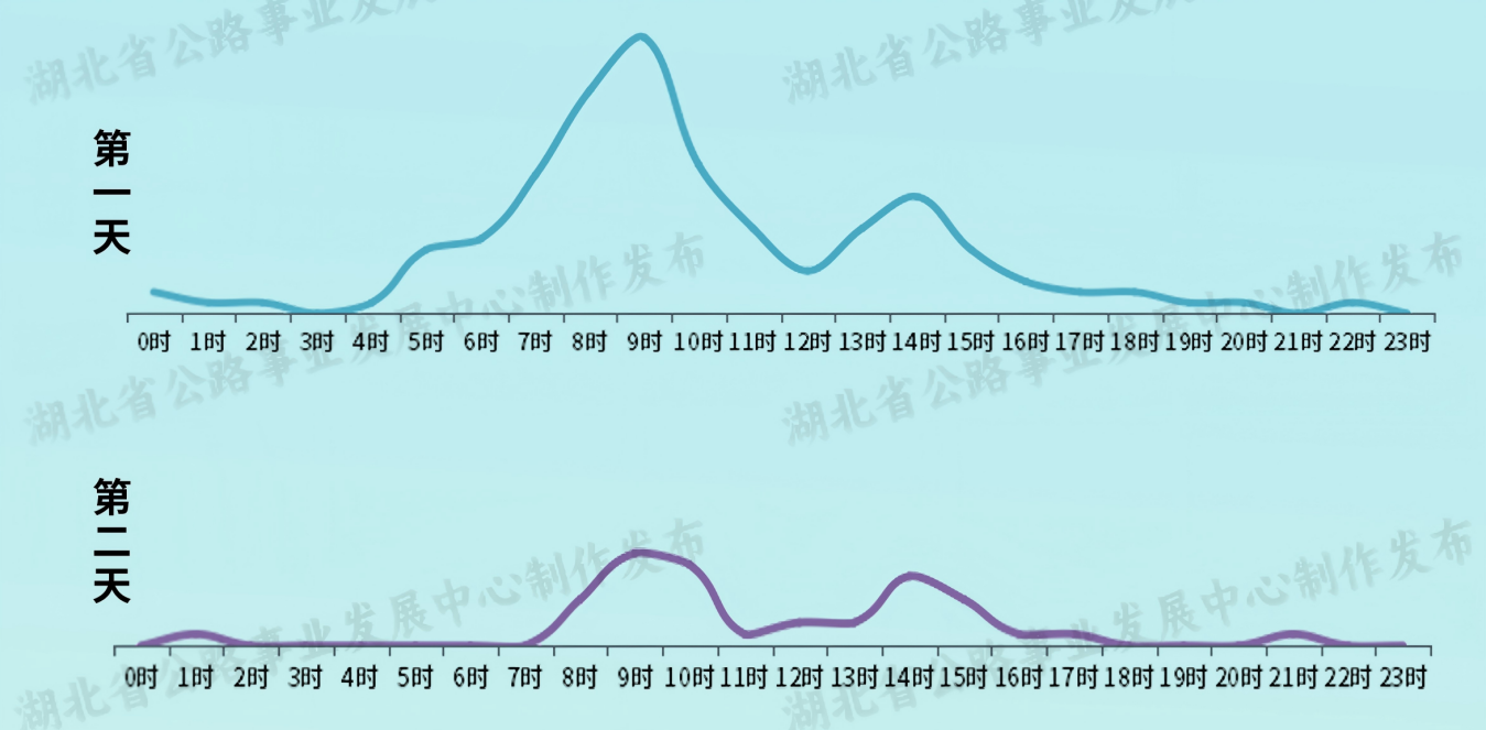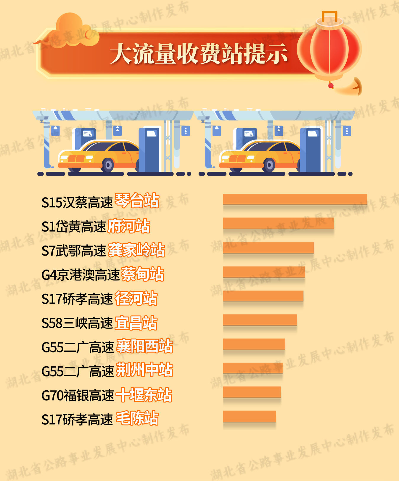 流量集中的高速公路收費(fèi)站主要有S15漢蔡高速琴臺站,S1岱黃高速府河站,S7武鄂高速龔家?guī)X站,G4京港澳高速蔡甸站,S17硚孝高速徑河站,S58三峽高速宜昌站,G55二廣高速襄陽西站、荊州中站,G70福銀高速十堰東站,S17硚孝高速毛陳站。