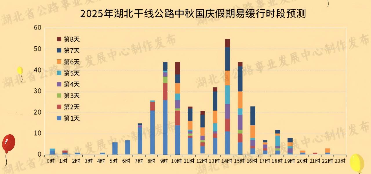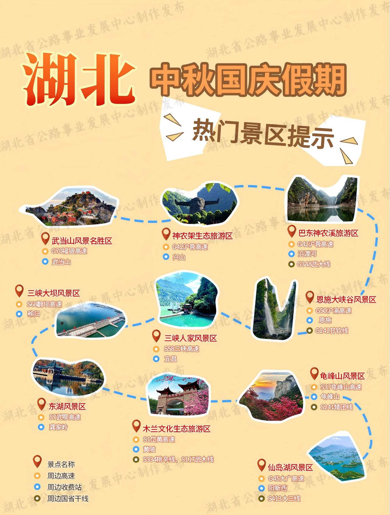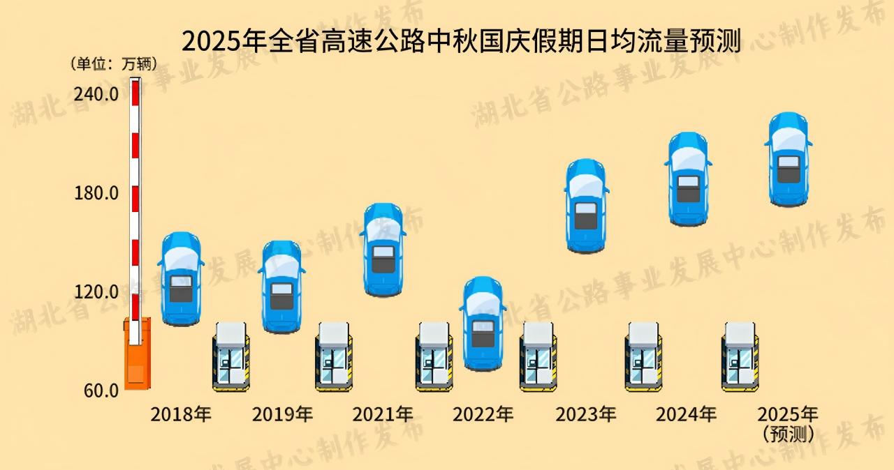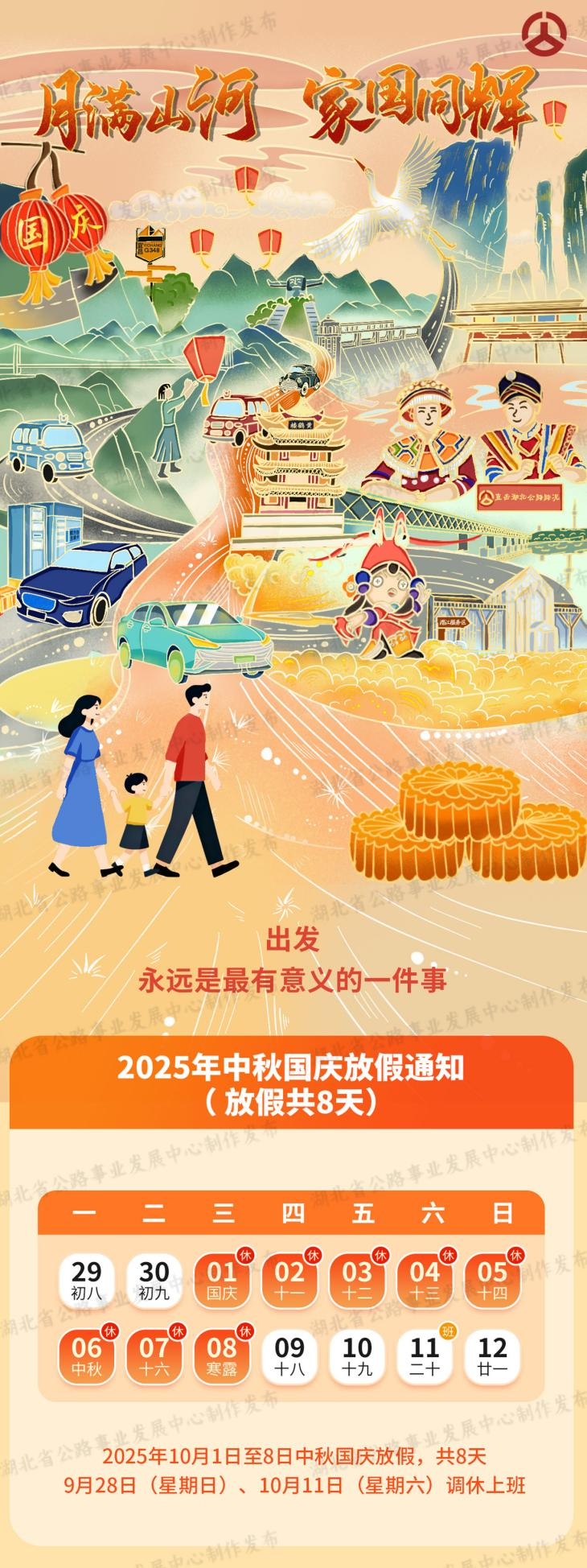 2025年中秋國慶假期即將到來,放假時(shí)間為10月1日至10月8日。根據(jù)國務(wù)院發(fā)布的《關(guān)于批轉(zhuǎn)交通運(yùn)輸部等部門重大節(jié)假日免收小型客車通行費(fèi)實(shí)施方案的通知》,中秋國慶假期期間,收費(fèi)公路對7座及以下小型客車免費(fèi)通行,免費(fèi)時(shí)間段為10月1日0時(shí)至10月8日24時(shí),共計(jì)八天。湖北省公路事業(yè)發(fā)展中心根據(jù)歷年來中秋國慶假期全省公路網(wǎng)運(yùn)行監(jiān)測情況分析,預(yù)計(jì)今年中秋國慶期間路網(wǎng)流量較平日大幅增長,社會公眾探親訪友、度假旅游等中短途出行需求將會集中釋放,省內(nèi)各市州周邊路段和通往省內(nèi)知名景區(qū)路段的交通流量將出現(xiàn)明顯增幅,省內(nèi)國高網(wǎng)、國省干線、武漢市周邊路段易出現(xiàn)不同程度的擁堵緩行?,F(xiàn)編制《2025年中秋國慶假期湖北省干線公路出行指南》,為公眾平安便捷出行提供參考。
