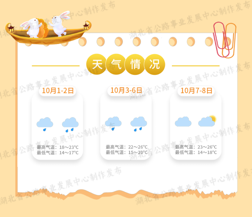 湖北省公路事業(yè)發(fā)展中心經(jīng)與省氣象服務(wù)中心會商研判,預(yù)計(jì)中秋國慶假期期間,我省多降水,氣溫有起伏。1日-2日全省有小到中雨,部分地區(qū)有大雨;3-6日全省還將有一次降水過程,省內(nèi)大部地區(qū)小到中雨;7-8日天氣轉(zhuǎn)好,大部陰天到多云,西部有小雨。具體預(yù)報(bào)如下: