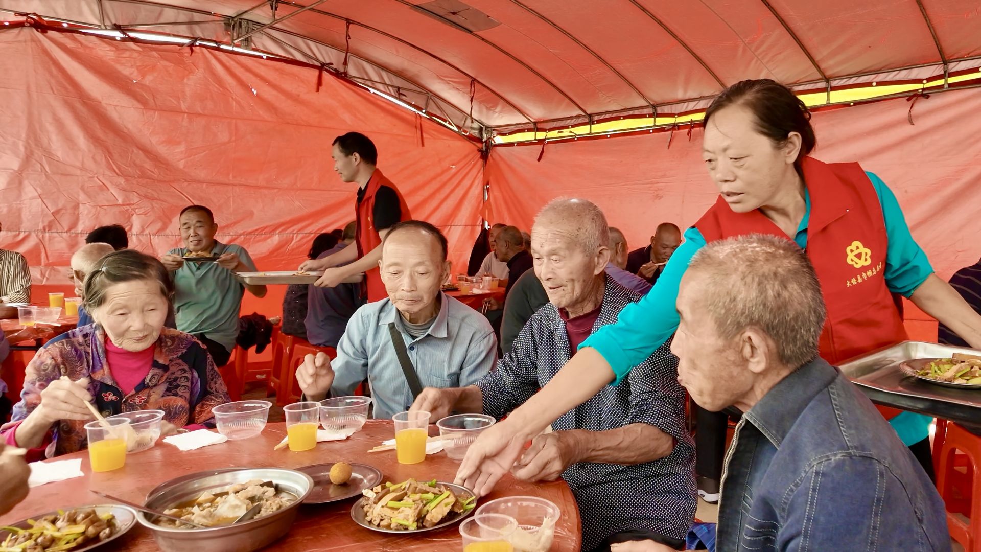 與此同時(shí),在村黨支部的組織動(dòng)員下,志愿者們?cè)缫衙β甸_(kāi)來(lái)。洗菜、切菜、烹制......大家分工協(xié)作,精心準(zhǔn)備豐盛的團(tuán)圓宴。灶臺(tái)上熱氣騰騰,空氣中彌漫著誘人香氣。北河村黨支部書(shū)記顏業(yè)青介紹:“我們提前三天就開(kāi)始準(zhǔn)備農(nóng)家菜,特意做了老人們愛(ài)吃的燒麥等特色美食,希望讓他們感受到節(jié)日的溫暖?!?/p>