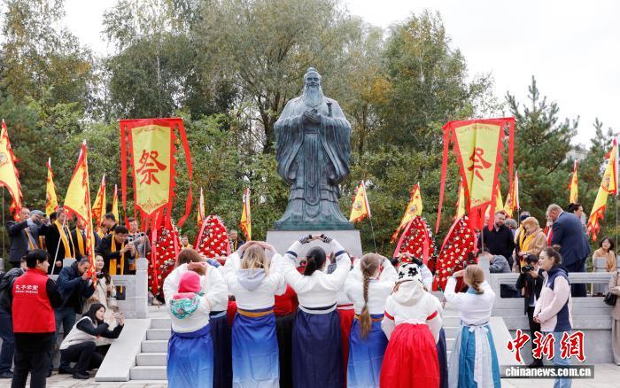 當(dāng)?shù)貢r(shí)間9月28日,第二屆“孔子文化節(jié)”在俄羅斯莫斯科中國(guó)貿(mào)易中心舉行。圖為俄羅斯中小學(xué)生按照中國(guó)傳統(tǒng)禮儀向孔子塑像行禮。中新網(wǎng)記者 田冰 攝