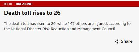 中新網(wǎng)10月1日電 據(jù)英國廣播公司(BBC)等外媒報道,菲律賓國家減災(zāi)管理委員會稱,截至當(dāng)?shù)貢r間10月1日8時,9月30日發(fā)生在該國宿務(wù)省的6.9級地震已造成26人死亡、147人受傷,2個市鎮(zhèn)已經(jīng)宣布進(jìn)入災(zāi)難狀態(tài)。