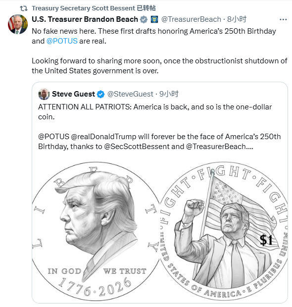 美國財政部官員布蘭登·比奇在社交媒體上回應了這一消息,并稱“這不是假新聞。這些紀念美國建國250周年的首批初稿是真的。”比奇還寫道,一旦美國政府“關門”事件結束,他期待能盡快分享更多相關信息。