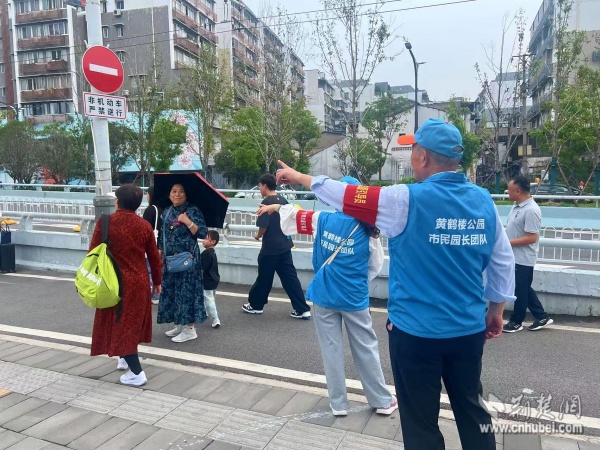 西廠口社區(qū)“市民園長”志愿團(tuán)隊在黃鶴樓景區(qū)開展文明引導(dǎo)與旅游咨詢。 通訊員供圖