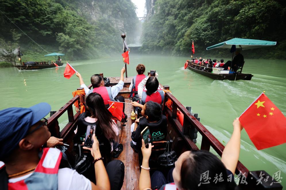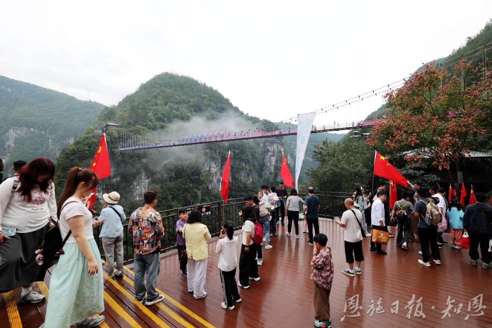 峽谷間,溪流潺潺,奇峰競秀,游客們或駐足凝望,或舉機(jī)留影,將大自然的鬼斧神工珍藏于鏡頭之中。孩子們在親水步道上歡笑嬉戲,大人們在觀景平臺上悠然小憩,處處洋溢著節(jié)日的歡愉。