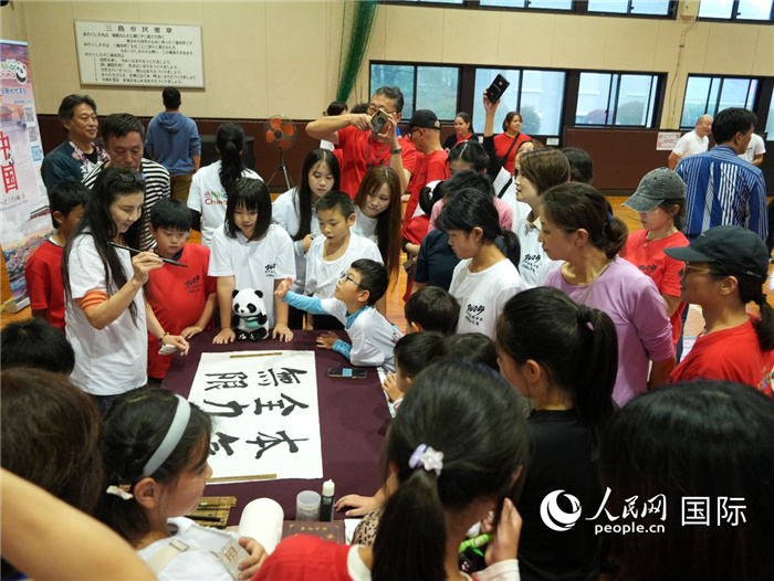 中國(guó)書法展示引來眾人圍觀。人民網(wǎng) 許可攝
