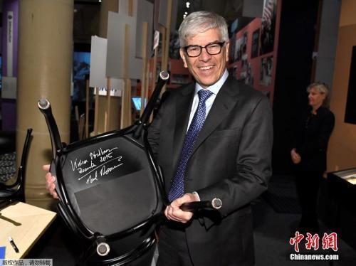 資料圖:2018年諾貝爾經(jīng)濟學獎獲得者保羅·羅默展示其簽名的椅子。