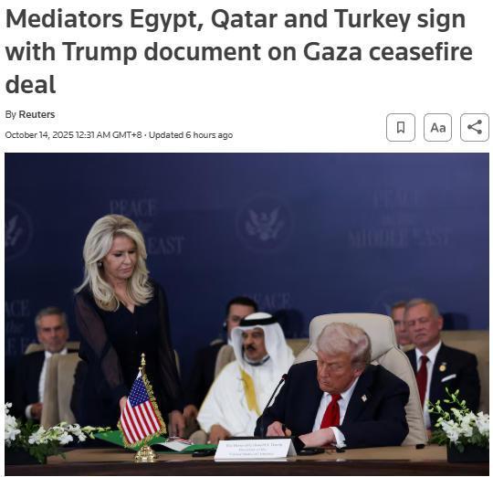 中新網(wǎng)10月14日電 據(jù)路透社報(bào)道,當(dāng)?shù)貢r(shí)間13日,美國總統(tǒng)特朗普在埃及沙姆沙伊赫,與埃及、卡塔爾和土耳其三國領(lǐng)導(dǎo)人共同簽署了關(guān)于加沙?;饏f(xié)議的文件。