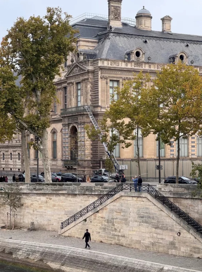 法國媒體《巴黎人報》援引其掌握的消息報道,嫌犯共有四人,其中兩人身穿工人裝及黃色反光背心偽裝成施工人員,乘升降吊籃進(jìn)入博物館;另外兩人各自駕駛摩托車接應(yīng)。警方在現(xiàn)場發(fā)現(xiàn)了兩臺切割機(jī)、一具噴燈、一些汽油、手套、一部對講機(jī)以及一條毯子。嫌犯疑似從塞納河一側(cè)施工區(qū)進(jìn)入建筑后,使用切割工具打開展廳玻璃,進(jìn)入阿波羅畫廊盜走珠寶。