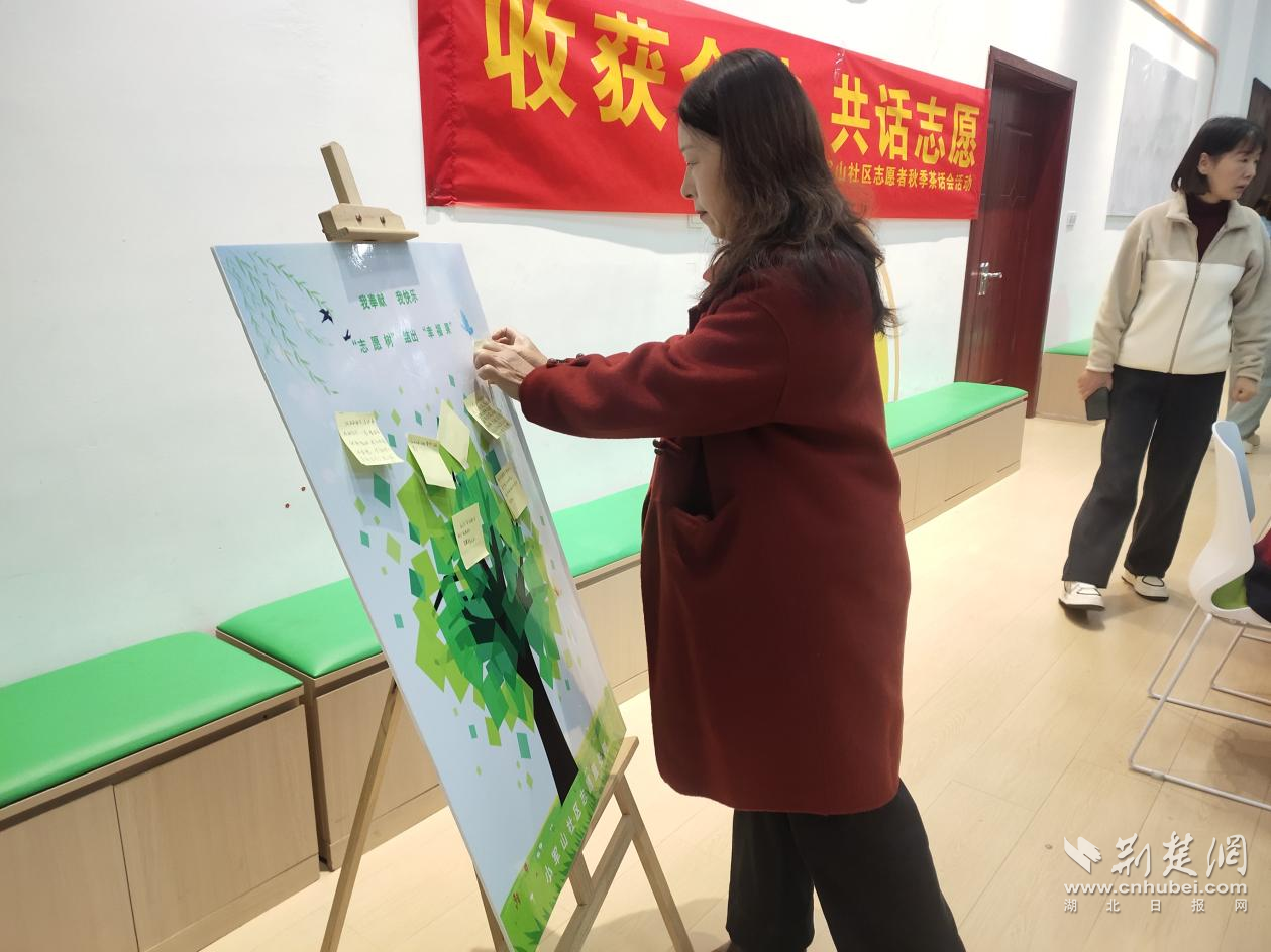 志愿者將寫(xiě)有服務(wù)記錄的便利貼貼在展板上。通訊員供圖