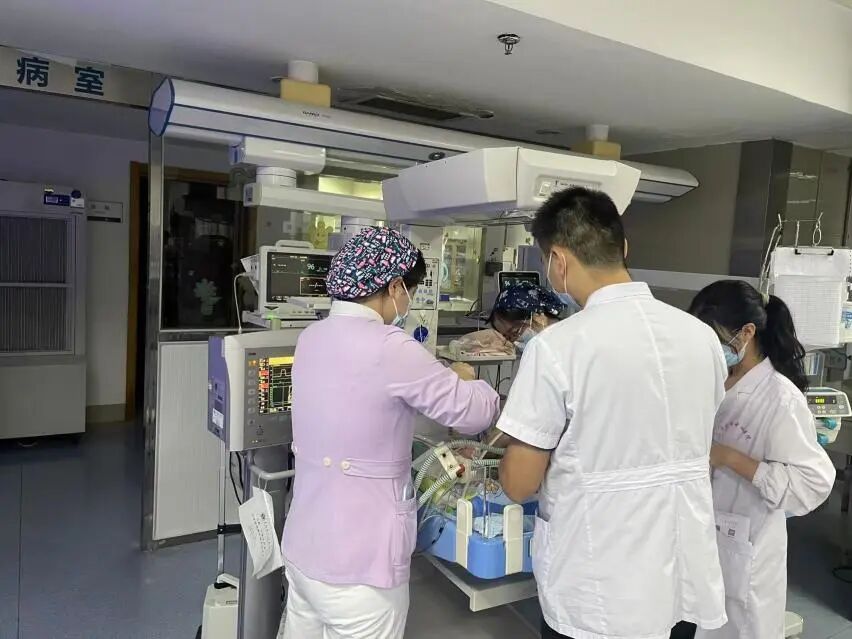 與此同時,在救護車返回本院前,新生兒科病房已做好全面準備:呼吸機、復(fù)蘇設(shè)備、嬰兒輻射保暖臺及B超設(shè)備等一應(yīng)俱全?;純阂唤?jīng)送達,便通過綠色通道直接接入新生兒重癥監(jiān)護室(NICU),醫(yī)療團隊迅速展開一系列搶救措施:機械通氣、補液、抗感染治療,并完成床邊X光、肺臟彩超、顱腦及心臟彩超等周密檢查。團隊依據(jù)檢查結(jié)果精準制定治療方案,細致落實護理措施,為危重新生兒提供全方位、高水平的醫(yī)療支持。