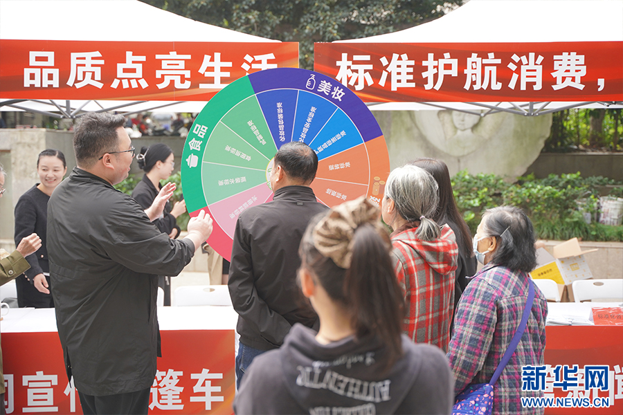 在答題區(qū)的“消費標準大轉(zhuǎn)盤”上,列出了食品、美妝、建材、家電等板塊延伸出的12個題目,聚焦衣食住行各類標準。市民們通過轉(zhuǎn)盤隨機選擇問題,標準化領域?qū)<液拖M者權益保護專家在一旁及時答疑。