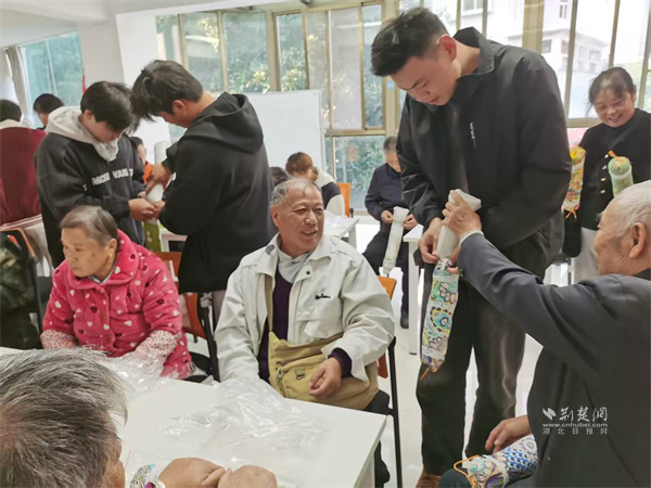 新就業(yè)群體成員與老年人協(xié)作完成艾草枕頭制作。 通訊員供圖