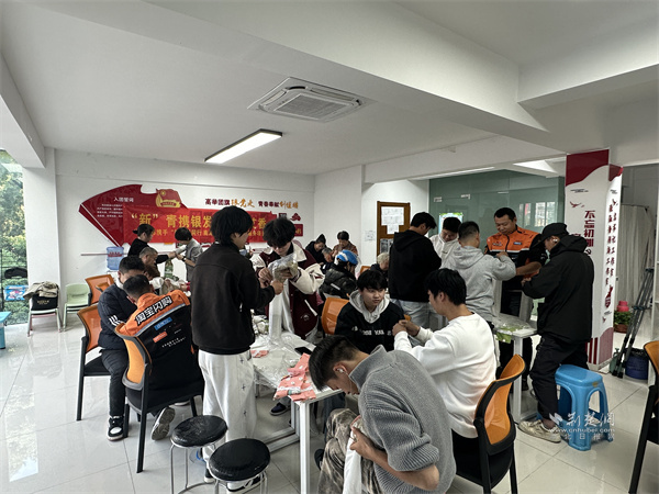 現(xiàn)場采用“1+1”結(jié)對模式,即1名新就業(yè)群體成員與1名老年人協(xié)作。年輕人負(fù)責(zé)填充艾草,老年人則憑豐富的生活經(jīng)驗(yàn),指導(dǎo)填充節(jié)奏和套枕套的技巧,兩代人配合默契。“平時(shí)送餐趕時(shí)間,很少和社區(qū)老人聊上幾句,今天才發(fā)現(xiàn)他們懂這么多生活技巧,太厲害!” 一位外賣騎手一邊小心將艾草填入枕套,一邊笑著感慨,身旁的老人則熟練幫他封口打結(jié)。