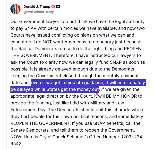 在10月25日,美國(guó)農(nóng)業(yè)部在其官網(wǎng)發(fā)布聲明,證實(shí)美國(guó)政府不會(huì)在“補(bǔ)充營(yíng)養(yǎng)援助計(jì)劃”資金耗盡后提供額外的資金補(bǔ)充。對(duì)此,美國(guó)25個(gè)民主黨領(lǐng)導(dǎo)的州及華盛頓特區(qū)組成的聯(lián)盟于10月28日提起訴訟,要求特朗普政府恢復(fù)該項(xiàng)目。在10月31日,美國(guó)聯(lián)邦法官裁定,特朗普政府必須動(dòng)用應(yīng)急資金支持“補(bǔ)充營(yíng)養(yǎng)援助計(jì)劃”,為低收入人群提供食品券。