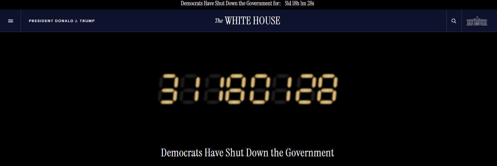 截至美東時(shí)間11月1日18時(shí)(北京時(shí)間11月2日6時(shí)),美國(guó)白宮官網(wǎng)實(shí)時(shí)刷新紀(jì)錄的這次美國(guó)政府“停擺”已經(jīng)持續(xù)了31天零18個(gè)小時(shí)。在白宮官網(wǎng)的頁(yè)面上,寫(xiě)有“民主黨人關(guān)停了政府”的字樣。