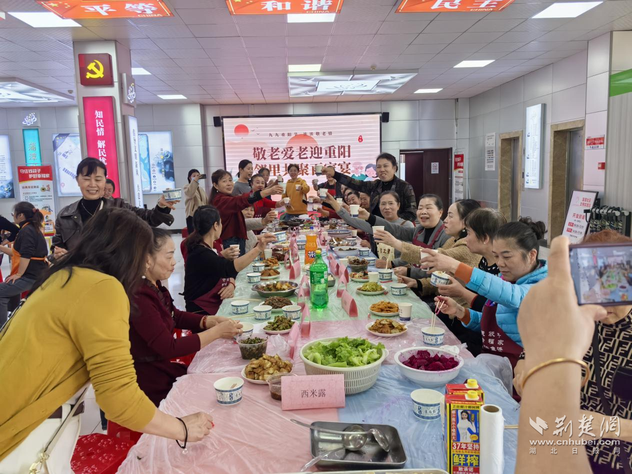 當天上午,蒲潭社區(qū)老年學校與居家養(yǎng)老服務中心以“敬老愛老迎重陽,鄰里共聚百家宴”為主題,舉辦了一場熱鬧的重陽百家宴活動。為廣大老年居民送上第一份“暖心禮”。社區(qū)居民歡聚一堂,煮餃子、炸雞冠餃,品佳肴、唱歡歌,共慶佳節(jié)。
